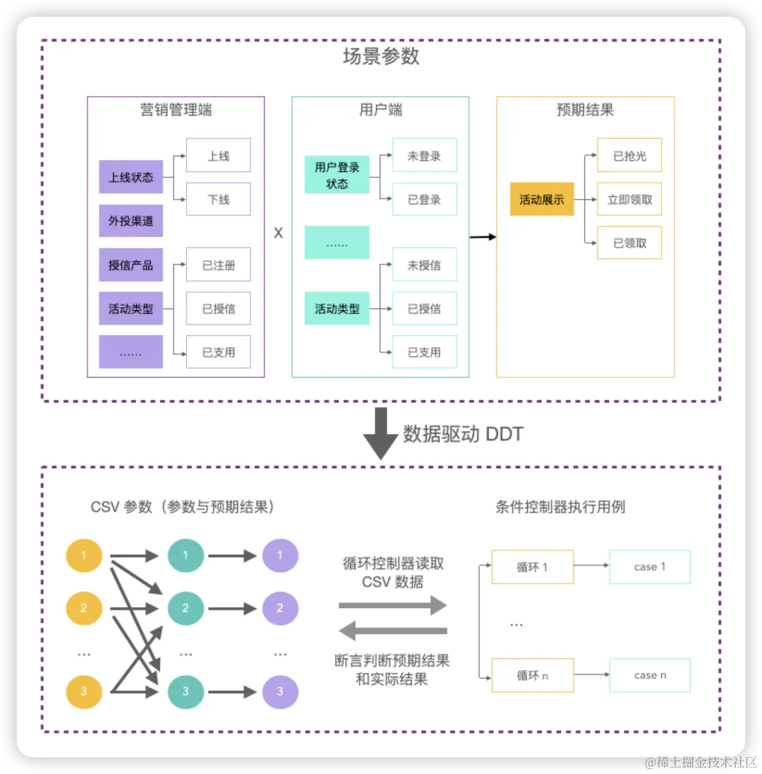 针对营销领域的业务形态,杭银消费金融的测试团队采用数据驱动的方式,通过构造批量场景数据来进行用例膨胀,最终实现覆盖所有营销场景的主流程自动化回归。