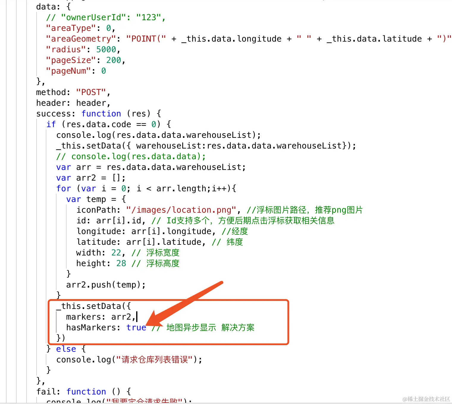 第三步:在onload中请求到数据赋值给markers之后,将hasMarkers设置为true