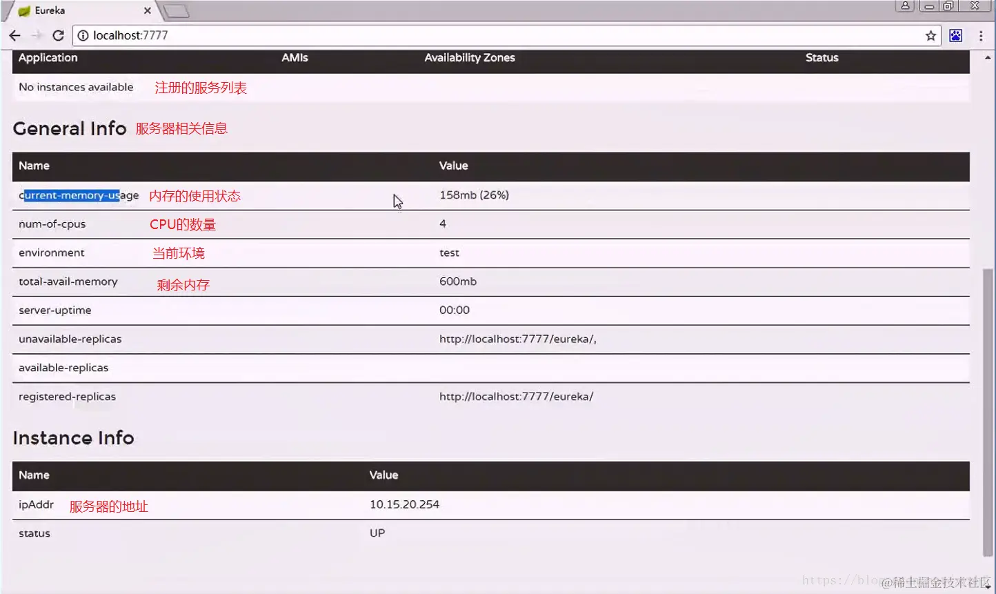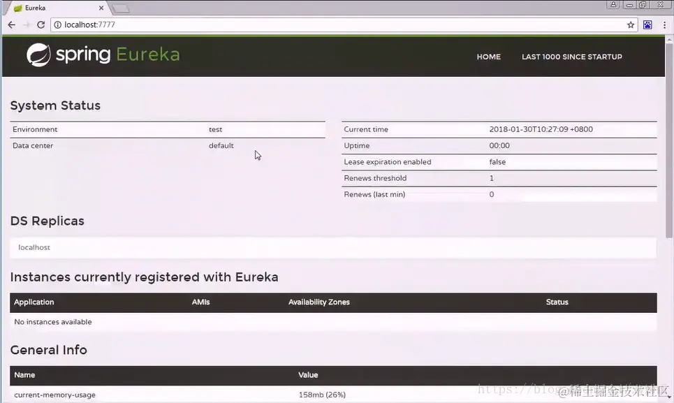 我们可以通过Instances currently registered with Eureka查看注册的服务,当前我们没有注册任何服务,所以显示No instances available