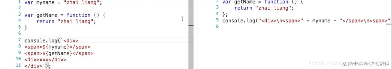 在传统的JavaScript里面我们写一个字符串换行,需要利用一个加号把它串起来,如果直接换行的话会报错。