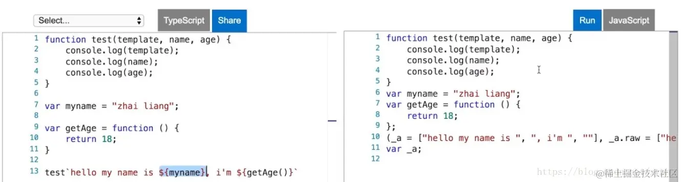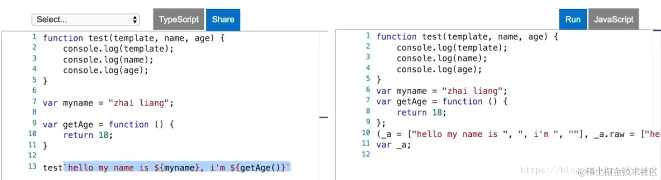 我们用字符串模板去调用这个test方法的时候,如果想使用字符串自动拆分的特性,你不用写圆括号了,直接写``就可以了