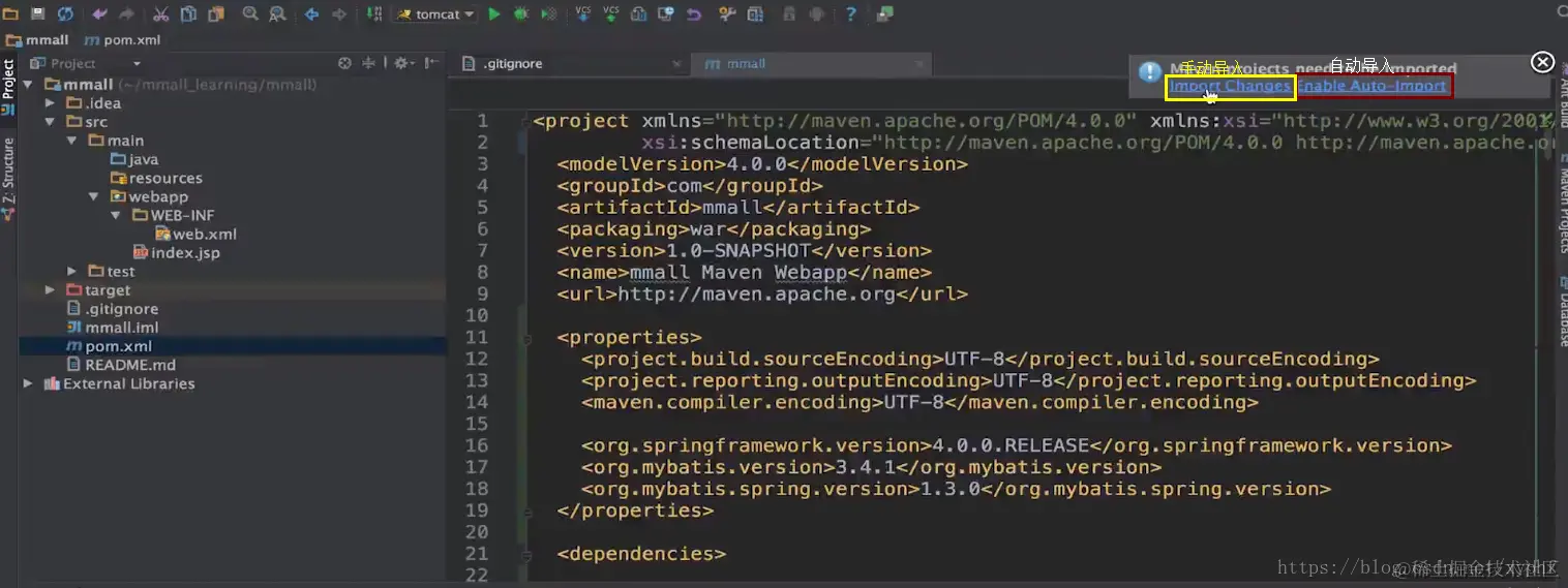 我们先把pom.xml文件拷贝下来,然后逐个讲解一下。我们点击手动导入。这样变化就导入进来了。