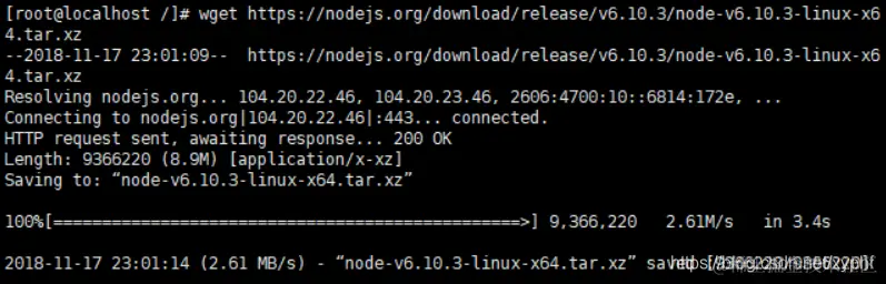 第二步:使用wget命令下载 wget https://nodejs.org/download/release/v6.10.3/node-v6.10.3-linux-x64.tar.xz