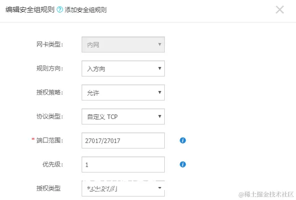 如果买的是阿里云的服务器,后期想使用可视化工具连接,需要打开安全组的27017端口,怎么打开百度把,就是这样