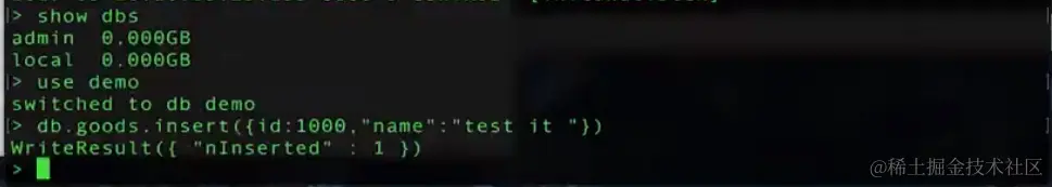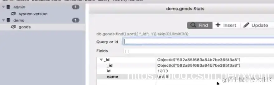 建一个goods表[我们称之为表,实际上它并不是表,它是一个集合]并插入一条数据