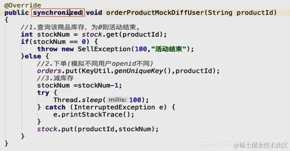 假如我们有很多商品,每个商品id不一样,但是他们都会访问这个方法,假如秒杀A商品的人很多,描述B商品的人很少。你一旦进入这个方法的话,都会一样的慢。只适合单点的情况。