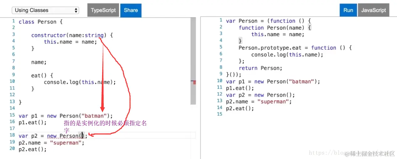 指的是我们通过构造函数来实例化一个约定,在实例化一个人的时候必须为它指定一个名字