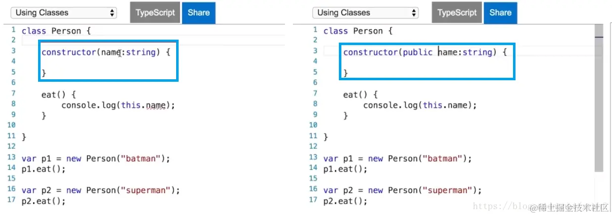这就相当于声明一个name属性,在构造函数的时候为这个name属性赋上值,所以我们运行时可以将这个name打印出来