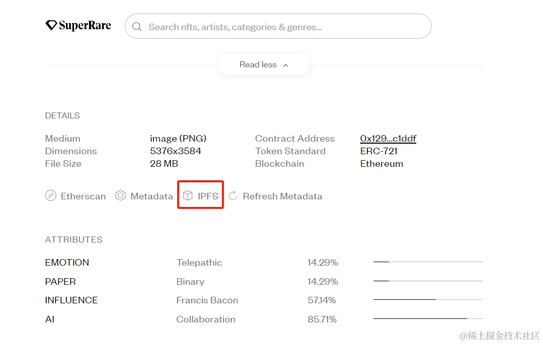 不同的平台使用的存储方式不一样,一般对于私链来说,肯定都是存储在自己的中心服务器上,而对于公链来说,一般可能会采取IPFS来存储,如SuperRare就是通过IPFS来存储。
