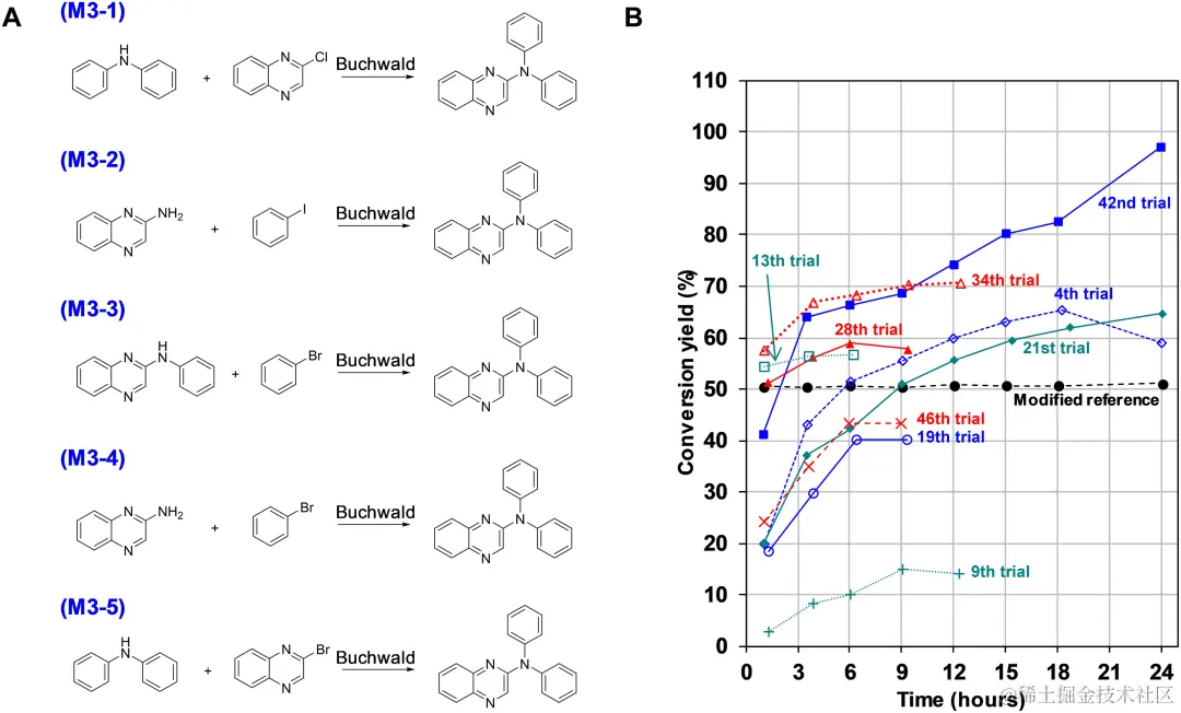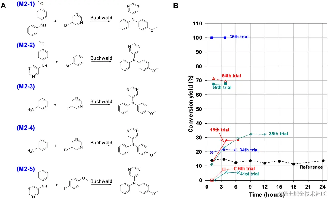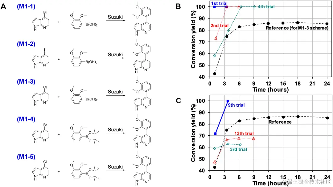 MPNN 模型以相对简单、数据驱动的方式有效地确定了成熟的铃木偶联反应 (M1) 的解决方案。相反,对于 M2 和 M3,MPNN 在单独识别有利条件方面面临挑战,但通过与 BO 合作成功找到了解决方案。所有情况下都实现了目标,整个搜索空间中的试验不到 1%,这突显了 HDO 模型在化学研究中与依赖人类专业知识和知识的传统方法相比的效率。Synbot 不仅利用其高通量实验能力,还利用人工智能模型指导的实时配方设计策略。这证明了 Synbot 在加速化学过程的发现和优化方面的有效性。
