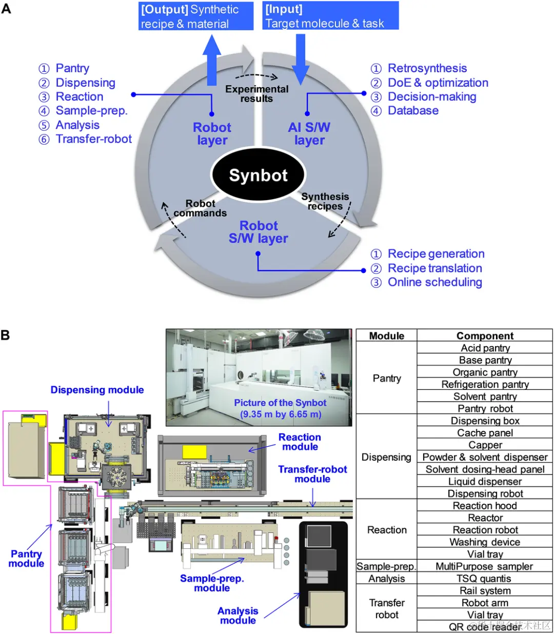 Synbot 包含基本模块,包括储藏室(pantry)、分配、反应、样品制备、分析和传输机器人模块,总体占地面积为 9.35 m x 6.65 m。人工智能和机器人技术的全面集成代表着朝着实现多功能、自主的分子智能合成平台迈出了重要一步。