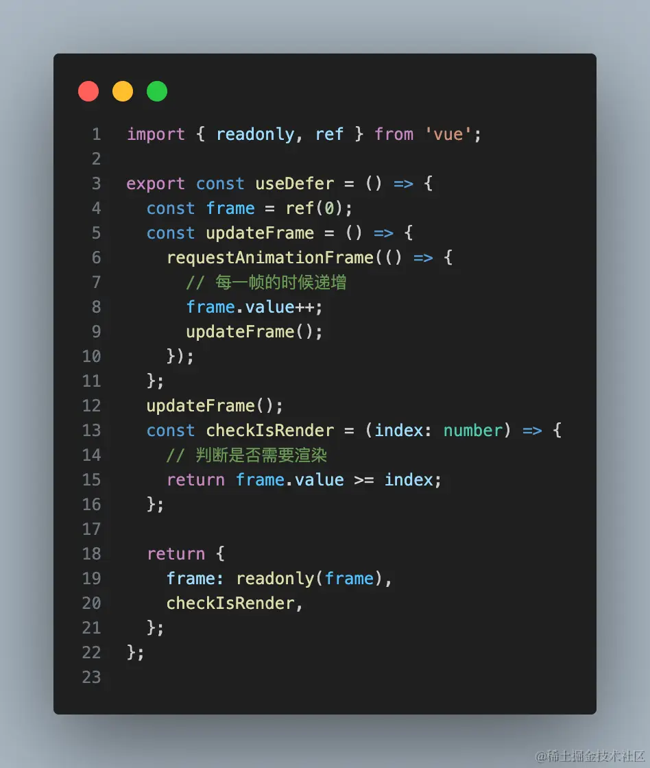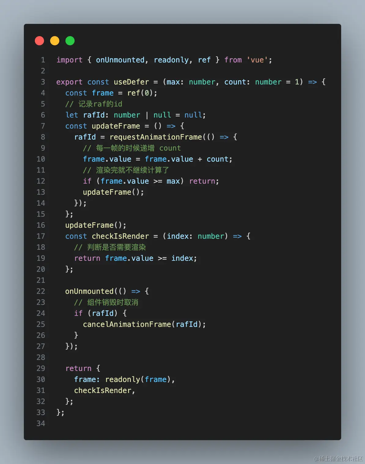 要怎么才能保证在每一个帧中去控制列表渲染呢?可以使用requestAnimationFrame,我们先封装一个useDefer