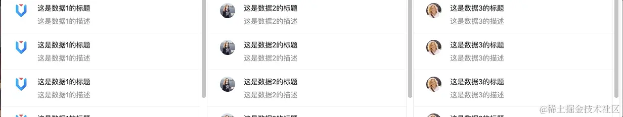 最近我们公司有一个页面,这个页面其实结构很简单,就是三个列表同时出现在某个项目的首页里,大概页面是这样的,差不多每一个列表都有100-1000条数据吧~数据量也不算多,三个列表顶天就3000条数据,并且数据也不复杂,所以也没做什么处理