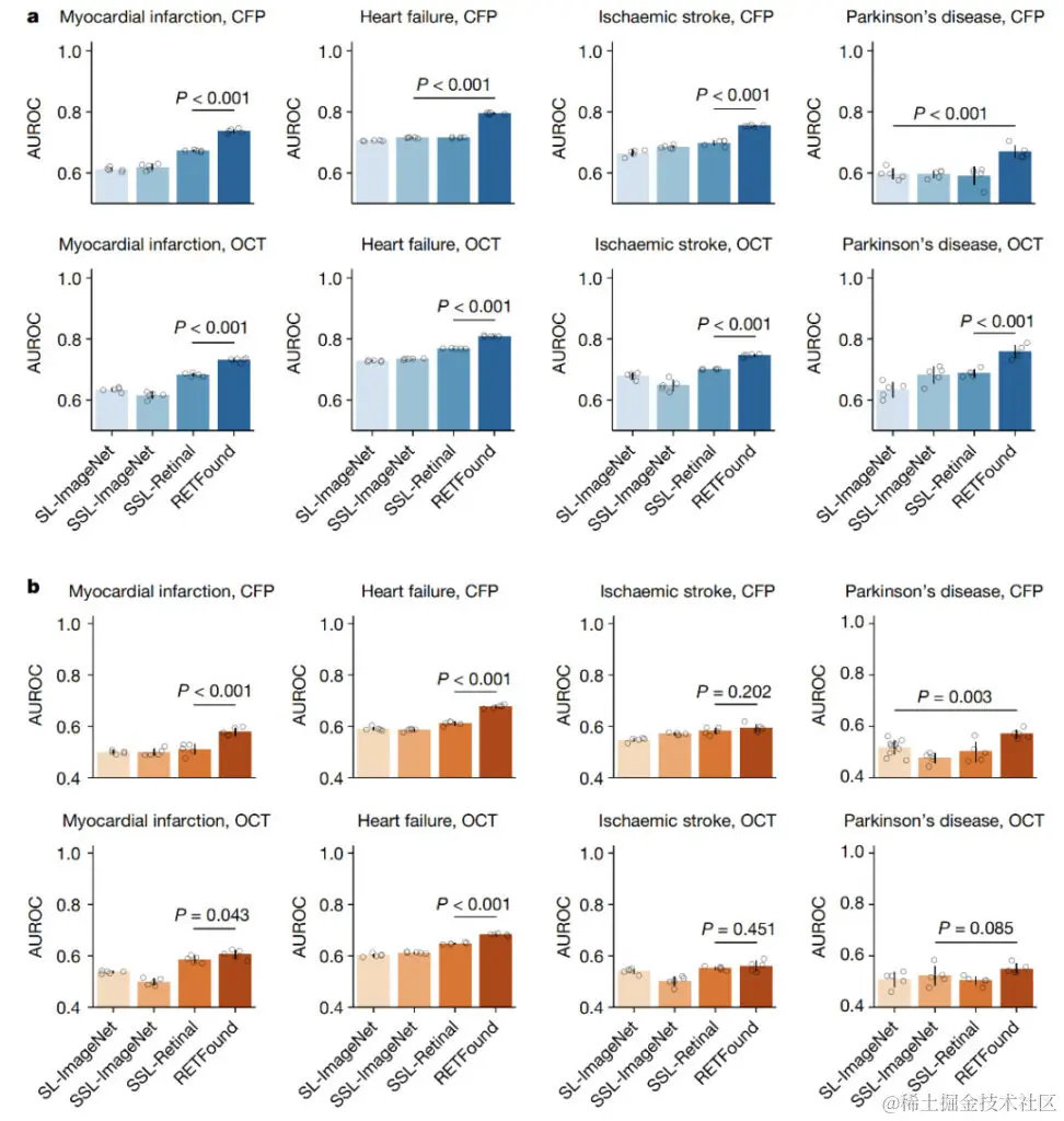 科研人员通过 4 种系统性疾病,来评估 RETFound 模型在预测视网膜图像与系统性疾病相关性方面的性能。