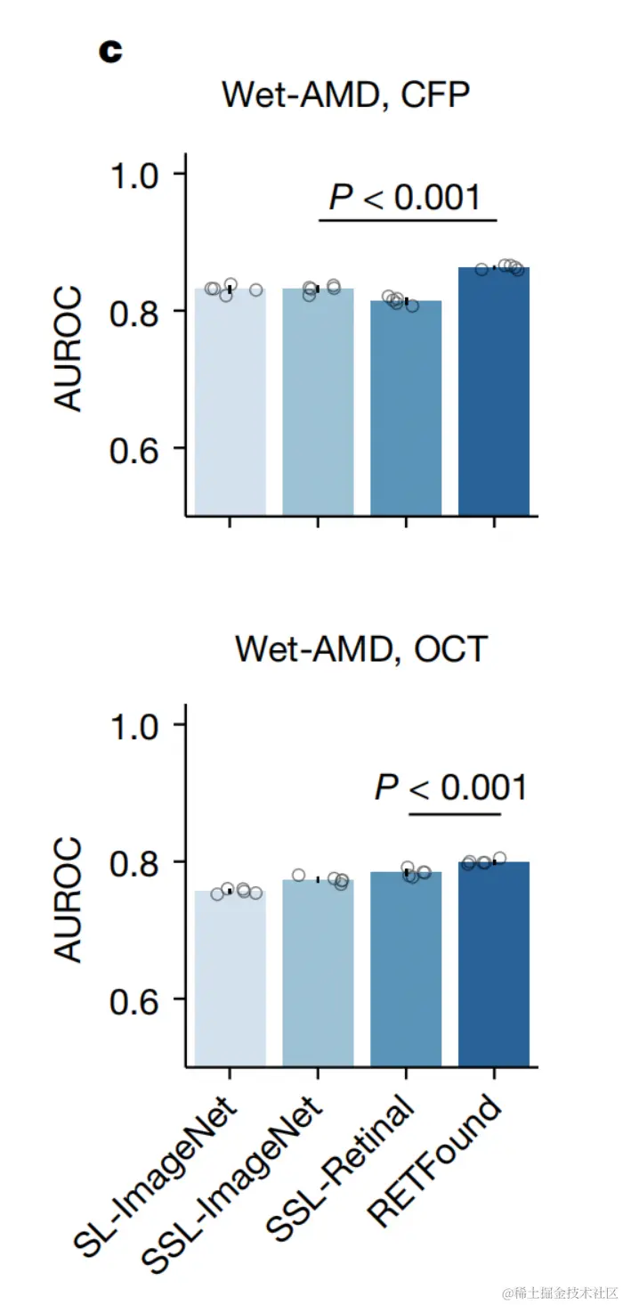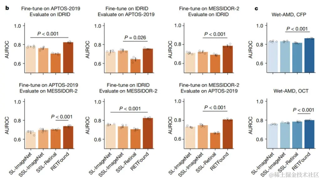 * 输入为 CFP 时,RETFound 性能最佳,AUROC 达到 0.862 (95% CI 0.86, 0.865),显著优于比较组;