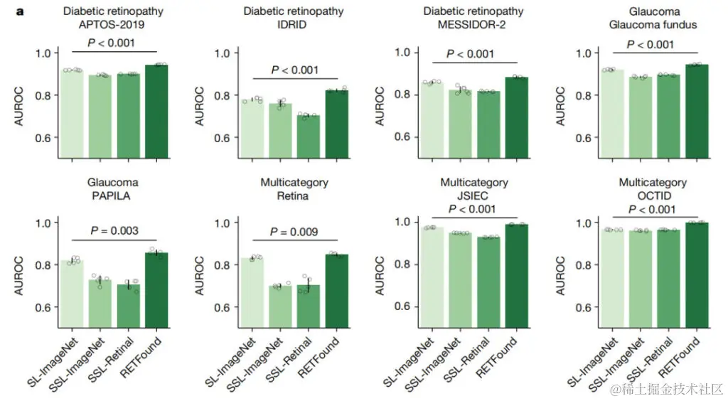**实验结果表明:**RETFound 在大部分数据集中,都取得了最佳性能,排名第二的是 SL-ImageNet 。