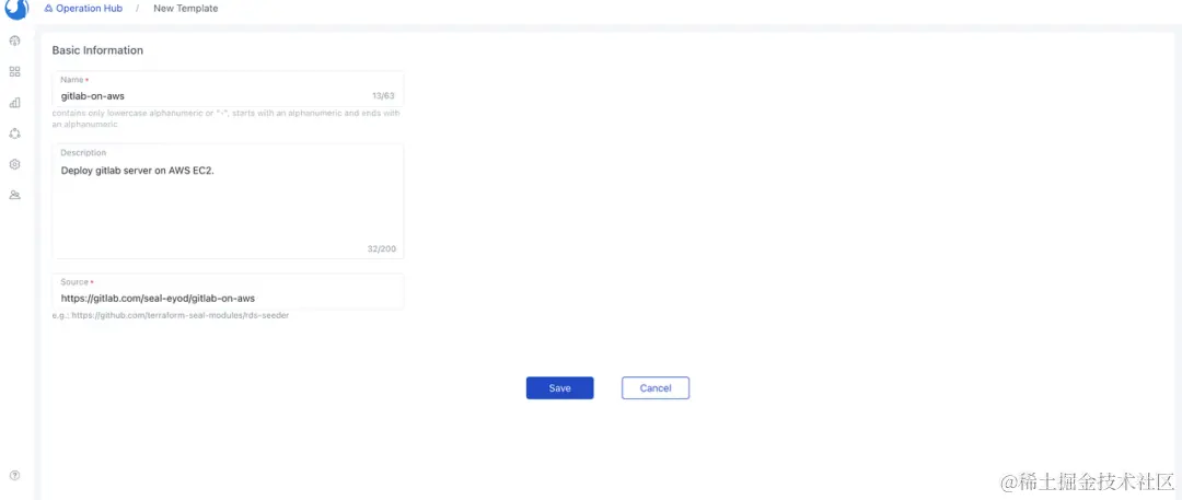 Operations Hub中的Template,然后选择我们最近创建的模板来制作一个新模板。这里我们将此模板命名为gitlab-on-aws。