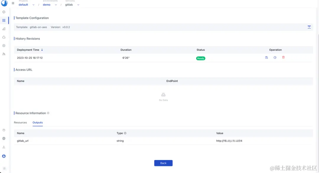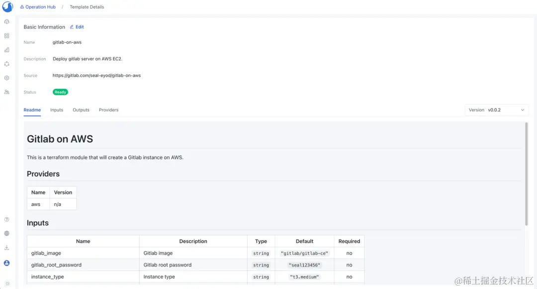 outputs.tf文件定义了服务创建后将显示给用户的模板输出。服务模板的输出也可以被其他服务引用。在本例中,我们定义了输出 gitlab_url,它是 Gitlab 实例的 URL。