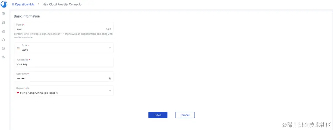 在 Operations Hub 的 Connectors 中添加 AWS。