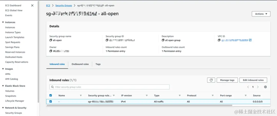 利用 gitlab-on-aws 模板创建服务。UI 表单中的分组和标签是根据我们之前定义的模板变量中对应的注释动态生成的。输入变量在模板的 variables.tf 文件中列出。为确保网络流量管理,EC2 实例需要一个安全组。我们可以创建一个名为all-open的安全组来允许所有网络流量,为了增强安全性,可以根据需要自定义规则。