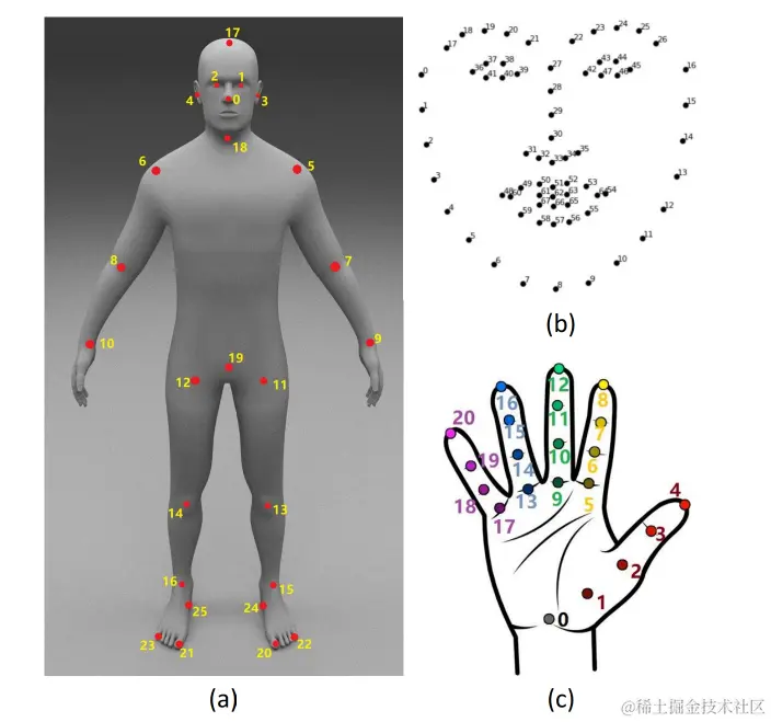 在 Whole-Body Multi-Person 人体姿态估计和跟踪领域,训练数据集是比较匮乏的,之前比较多的是 Only-Person 人体姿态估计的数据集。在 AlphaPose 的训练中,也提出了一个新的称为 Halpe-FullBody 的数据集用于训练这种任务,标注的关键点包括 body & foot、face、hand,如下,