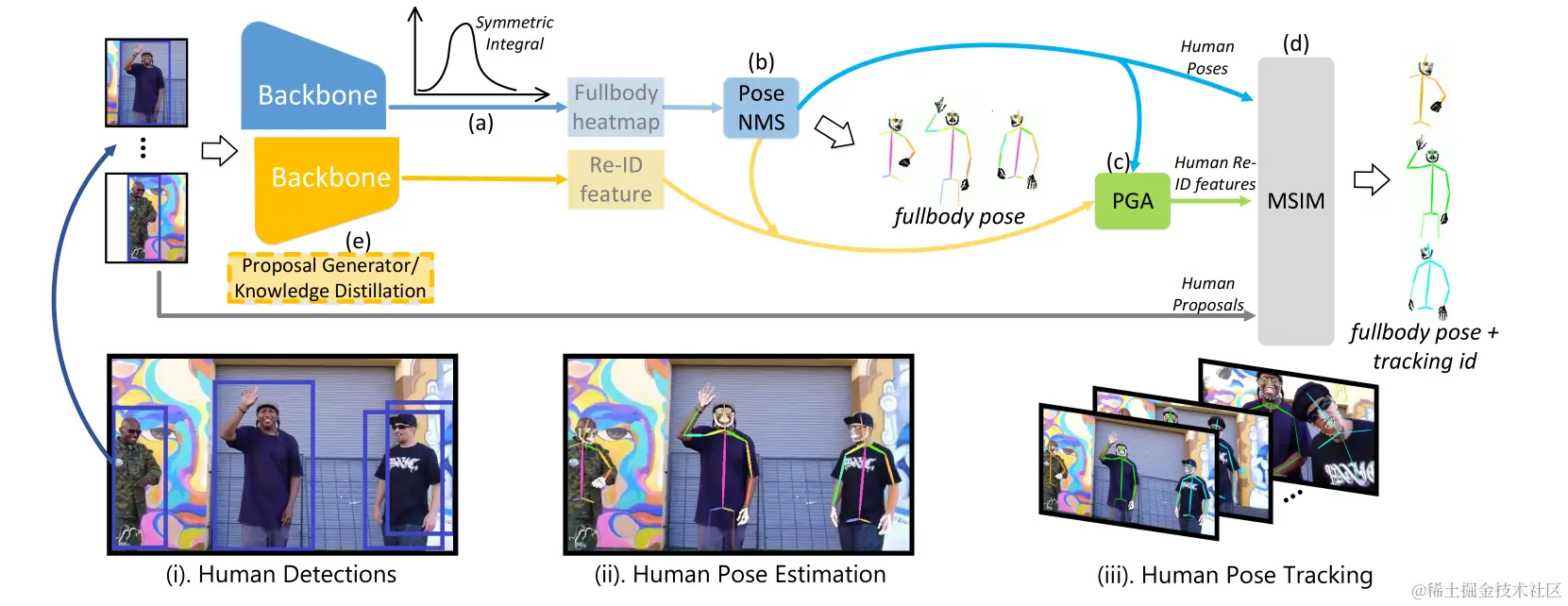 - d => MSIM (Multi-stage Identity Matching) ==> 多阶段的身份匹配用于最终的人体跟踪,包括考虑形体姿态、re-ID 特征和检测框。形体的跟踪通常是针对于视频序列,对于形体姿态、re-ID 特征、检测框,它们其实每一个都能够用于行人跟踪,但综合考虑三者,明显能够提高跟踪的鲁棒性;