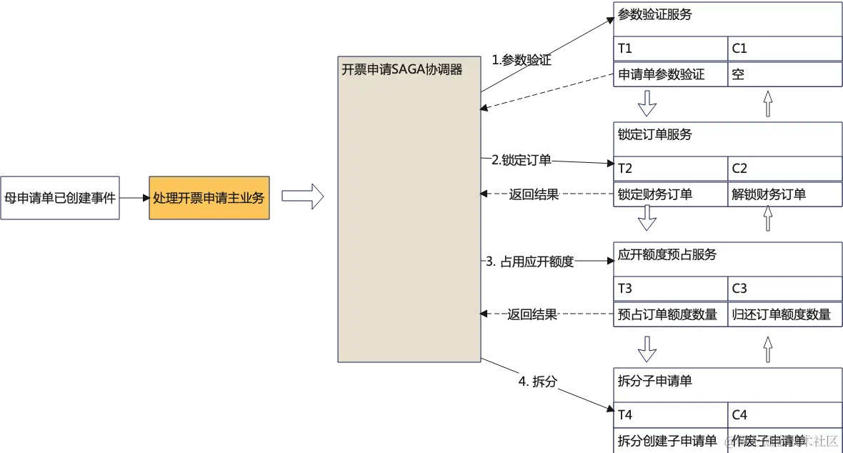 Saga在发票开票申请的案例如下所示,提票申请被拆分为2个主要的SAGA协调器。