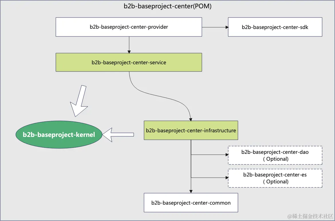 其中: b2b-baseproject-kernel 为内核的Maven工程示例, b2b-baseproject-center为读写服务汇总的中心对外服务工程示例。