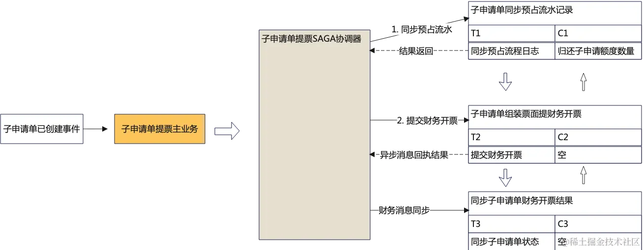 ② 在接收到【子申请单已经创建事件】即触发生成协调器2调度——子申请单提票SAGA协调器, 用于子申请单预占流水记录、提交财务开票、接收财务状态同步子申请单状态。