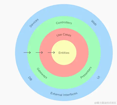 整洁架构最主要原则是依赖原则,它定义了各层的依赖关系,越往里,依赖越低,代码级别越高。外圆代码依赖只能指向内圆,内圆不知道外圆的任何事情。一般来说,外圆的声明(包括方法、类、变量)不能被内圆引用。同样的,外圆使用的数据格式也不能被内圆使用。