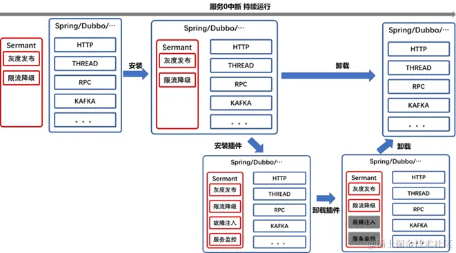 在本次中国开源年会前夕,Sermant也发布了其1.2.0 release版本,带来了多个令人兴奋的新特性,在该版本中,Sermant优化其原有的类隔离架构,使得类隔离更加全面,并且从开发者视角,基于Sermant开发服务治理能力变得更简单,开发者对类隔离无感知;该版本还带来了服务治理插件热插拔的能力,这一能力极大提升Sermant使用的灵活性,在接入或升级服务治理能力时无需再重启服务,实现不停机注入服务治理能力。