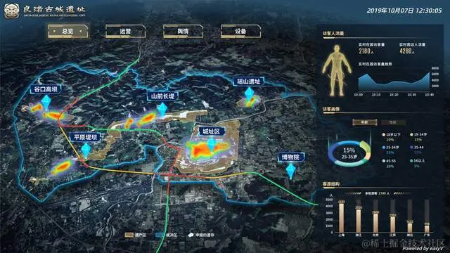 大屏总览的主视觉形象以良渚古城遗址的卫星地图为元素,在此基础上进行数据图形的形象设计来展现数据信息,右侧展现景区的实时访客人流量 ,访客画像以及客源结构。