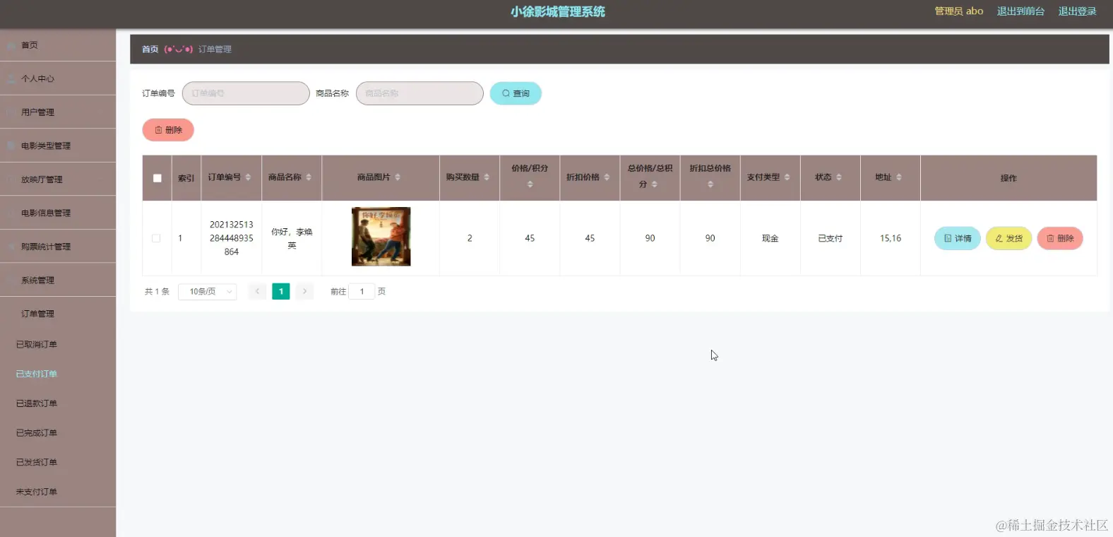 订单管理,在订单管理页面通过查看订单编号、商品名称、商品图片、购买数量、价格/积分、折扣价格、总价格/总积分、折扣总价格、支付类型、状态、地址等信息进行详情、发货、删除操作。如图5-10所示。