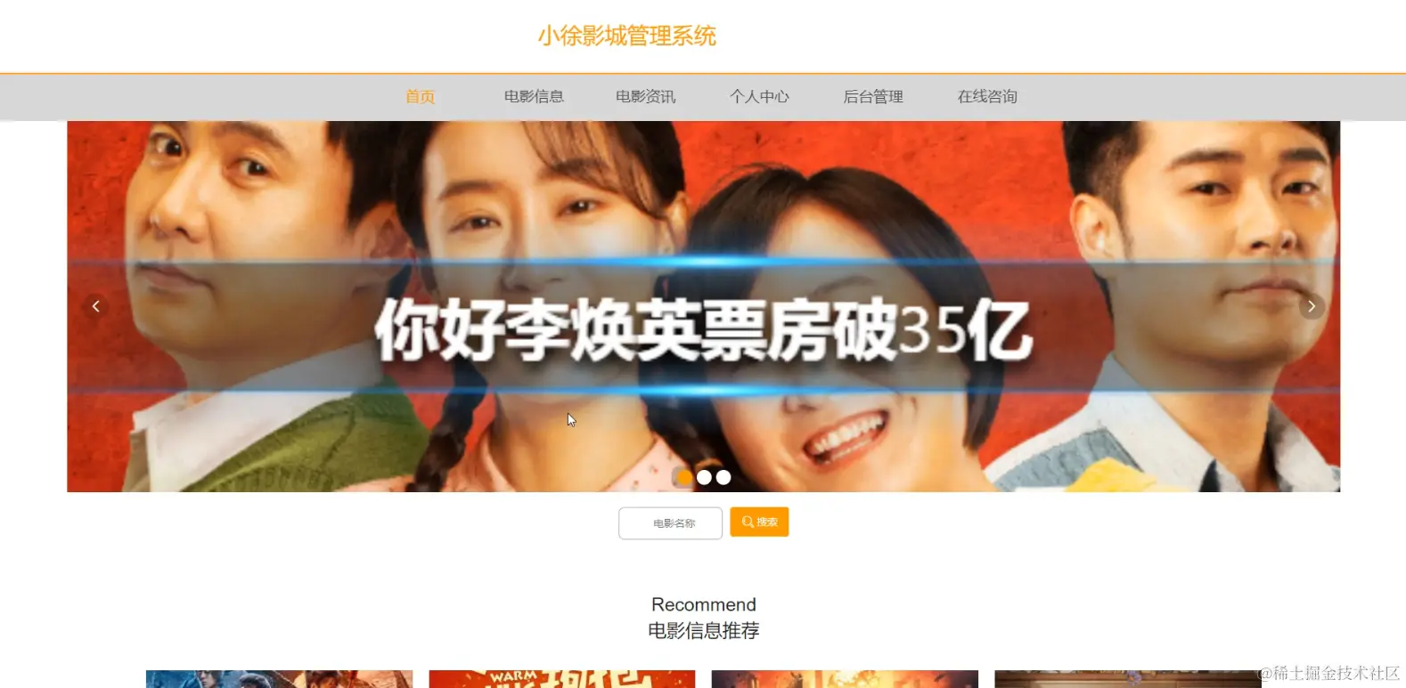 小徐影城管理系统,在前台首页可以查看首页、电影信息、电影资讯、个人中心、后台管理、在线客服等内容,如图5-11所示。
