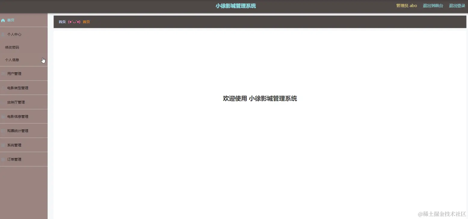 管理员通过后台管理,进入页面可以获取首页、个人中心、用户管理、电影类型管理、放映厅管理、电影信息管理、购票统计管理、系统管理、订单管理等功能模块内容,如图5-2所示。