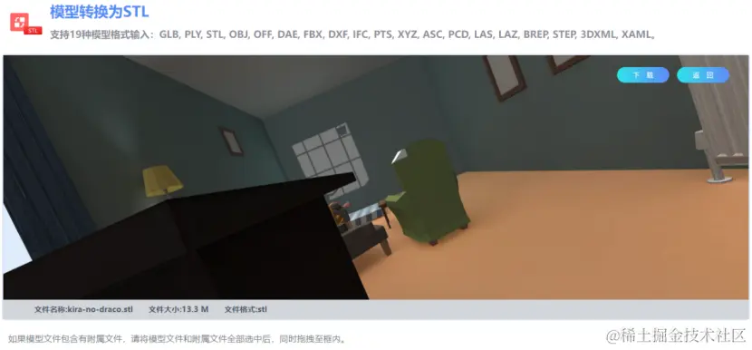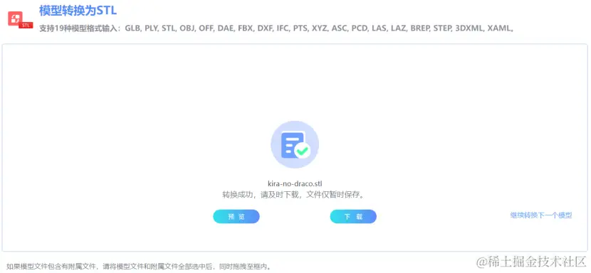 在GLB转STL网站完成模型格式转换完成后,此时可以在线预览模型转换结果,可以直接下载转换结果,也可以继续转换下一个模型。
