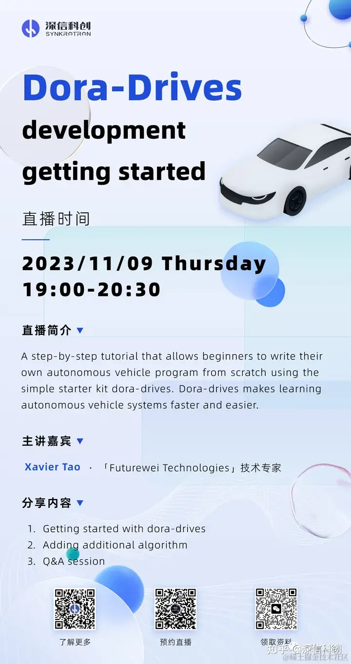 11月09日19:00-20:30,「Futurewei Technologies」技术专家Xavier Tao将做客『自动驾驶之心』直播间,为大家带来“Dora-Drives:从0编写自动驾驶程序”的分享!精彩不容错过,邀您关注!😀