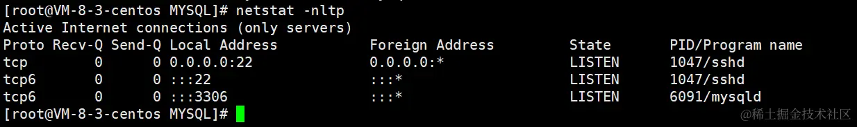 我们可以通过:netstat -nltp 来查看mysqld对应的服务端号