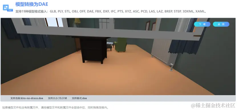 在GLB转DAE网站完成模型格式转换完成后,此时可以在线预览模型转换结果,可以直接下载转换结果,也可以继续转换下一个模型。