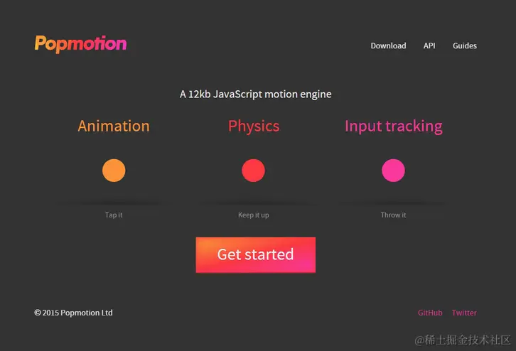Popmotion 是一个只有12KB的 JavaScript 运动引擎,可以用来实现动画,物理效果和输入跟踪。原生的DOM支持:CSS,SVG,SVG路径和DOM属性的支持,开箱即用。