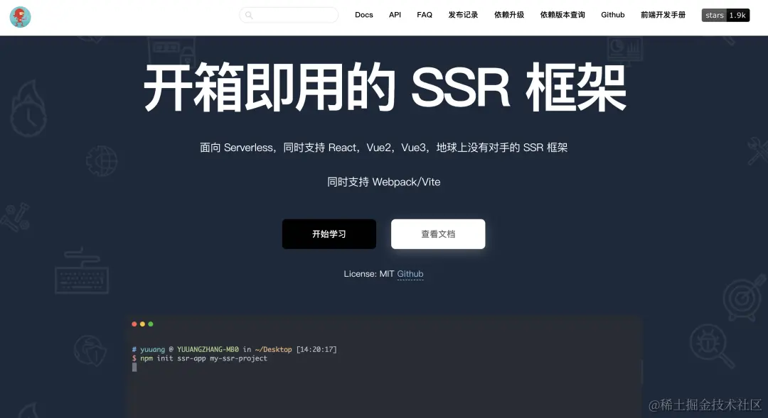 ssr 框架是为前端框架在服务端渲染的场景下所打造的开箱即用的服务端渲染框架。面向 Serverless,同时支持 React,Vue2,Vue3。