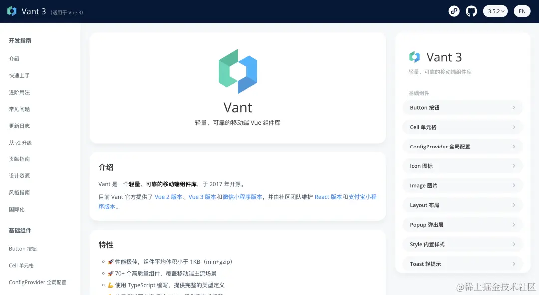 Vant 是一套轻量、可靠的移动端组件库。通过 Vant,可以快速搭建出风格统一的页面,提升开发效率,支持 Vue 3。
