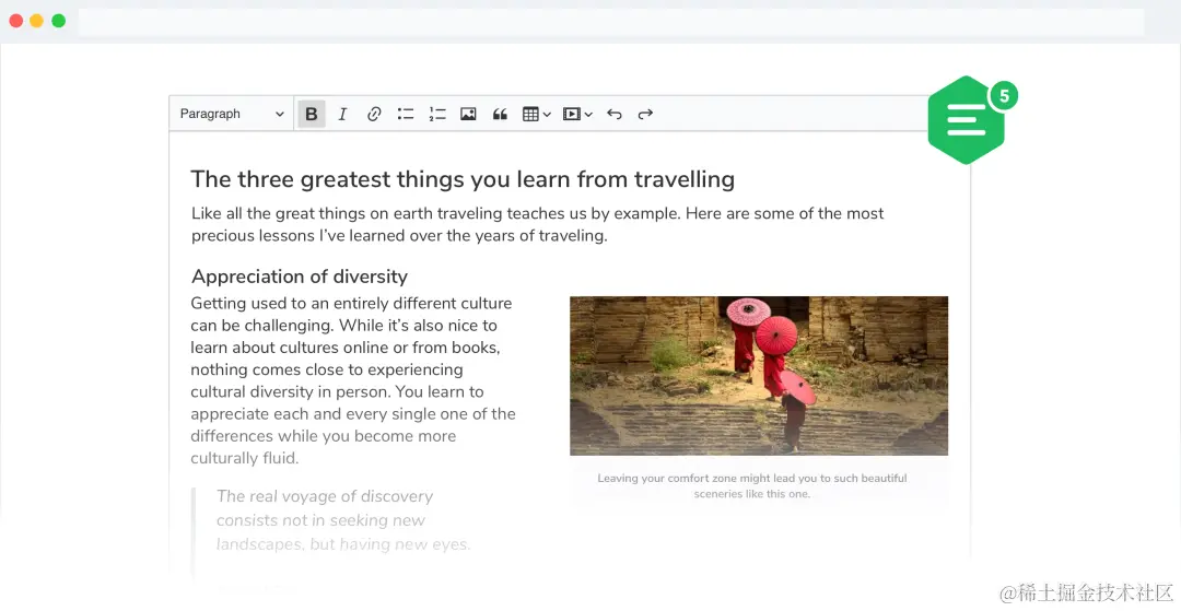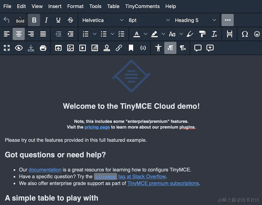 TinyMCE 是一个热门的富文本编辑器。它的目标是帮助其他开发人员构建精美的 Web 内容解决方案。它易于集成,可以部署在基于云的、自托管或混合环境中。该设置使得合并诸如 Angular、React 和 Vue 等框架成为可能。它还可以使用 50 多个插件进行扩展,每个插件都有 100 多个自定义选项。