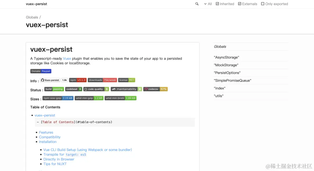 vuex-persistedstate 是一个支持 Typescript 的Vuex插件,使你能够将应用程序的状态保存到持久存储中,例如 Cookies 或 localStorage。