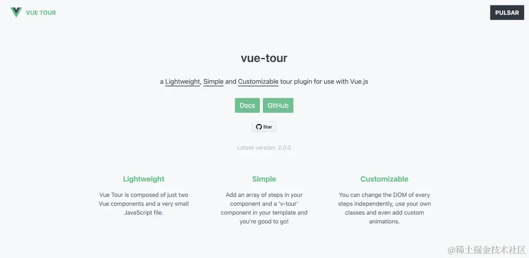 Vue Tour 是一个轻量级、简单且可定制的导览插件,可与 Vue.js 一起使用。它提供了一种快速简便的方法来指导用户完成你的应用程序。