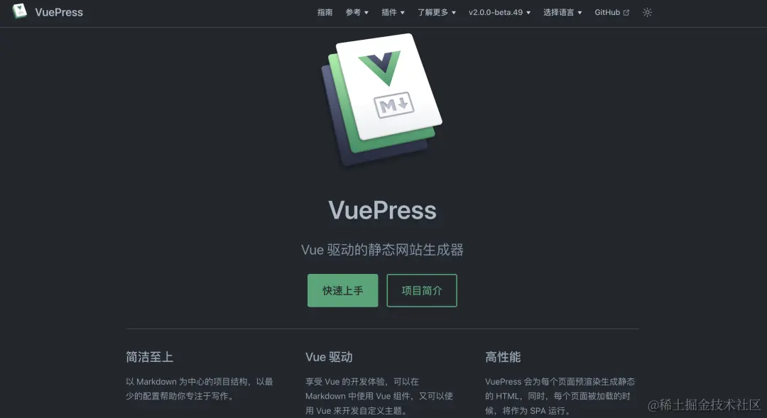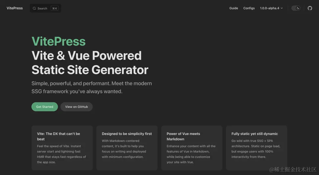 VitePress 是 VuePress 的继承者,建立在vite 之上。目前,正处于alpha阶段。它已经适合开箱即用的文档使用,但配置和主题 API 可能仍会在次要版本之间发生变化。