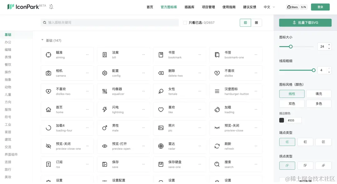 IconPark 提供超过 2400 个高质量图标,还提供了每个图标的含义和来源的描述,便于开发者使用。除此之外,该网站还可以自定义图标,这是与其他图标网站与众不同的地方。该图标库是字节跳动旗下的技术驱动图标样式的开源图标库。