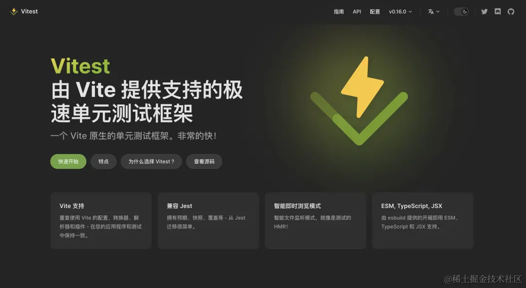 Vitest 是一个由 Vite 提供支持的极速单元测试框架。其和 Vite 的配置、转换器、解析器和插件保持一致,具有开箱即用的 TypeScript / JSX 支持。