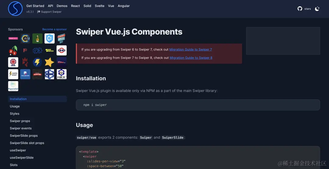 Swiper 是一款免费以及轻量级的移动设备触控滑块的框架,使用硬件加速过渡。主要使用与移动端的网站、网页应用程序,以及原生的应用程序。