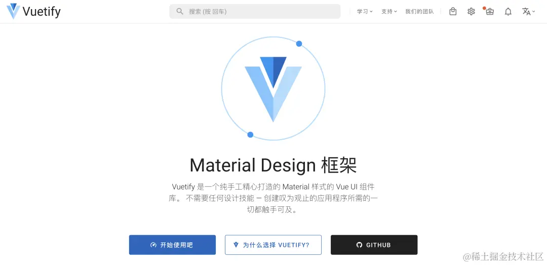 Vuetify 是一个基于 Vue.js 精心打造 UI 组件库,整套 UI 设计为 Material 风格。能够让没有任何设计技能的开发者创造出时尚的 Material 风格界面。